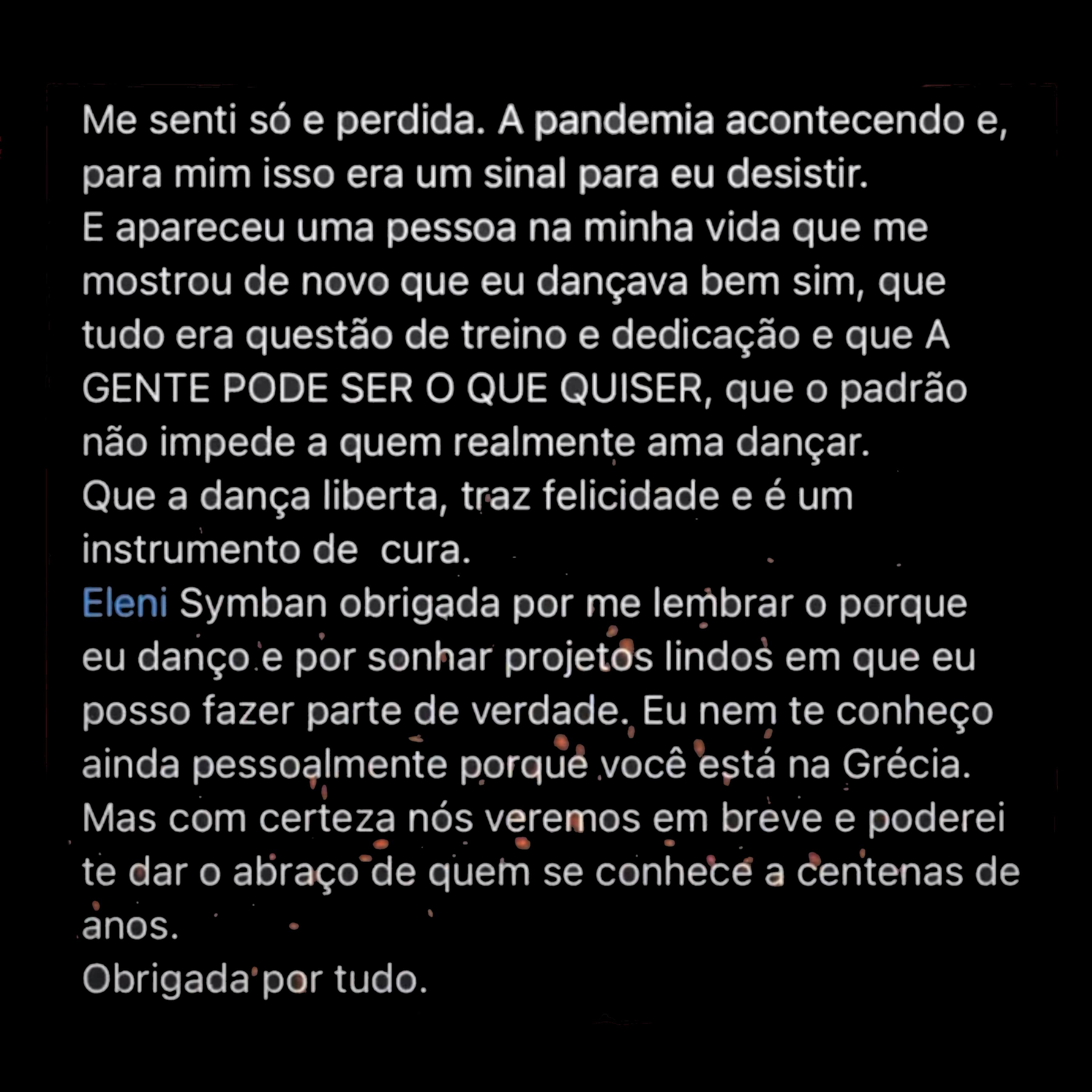 Eleni Symban é especialista em danças étnicas e sensuais com foco terapêutico, já ajudou muitas mulheres no Brasil e no Exterior a transformarem suas vidas. Através de suas aulas 100% on-line bem como na utilização de aulas remotas ao vivo. Sua primeira formação acadêmica foi em direito, membro da ordem dos advogados Eleni, sempre defendeu os direitos das mulheres. Bem como prestou serviços como conselheira representante dos brasileiros na Grécia. Eleni é formada pela escola de dança pública de Atenas, Grécia. Vencedora de vários concursos internacionais em três categorias de danças diferentes. Homenageada com o prêmio Mio Vacite. Membro do Conselho Internacional de Dança, bem como presidente da Seção do Conselho Internacional de Dança CID Unesco.Orientando as mulheres e transformando vidas. Agora você poderá desfrutar de tudo isso, irei te guiar por um caminho transformador na sua vida em todos os sentidos.
